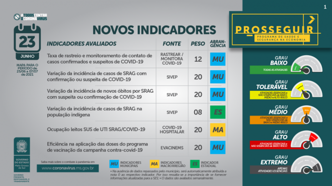 Na bandeira cinza, que orienta apenas o funcionamento de atividades listadas como essenciais no Prosseguir, estão os municípios de Água Clara, Aparecida Do Taboado, Camapuã e Japorã.