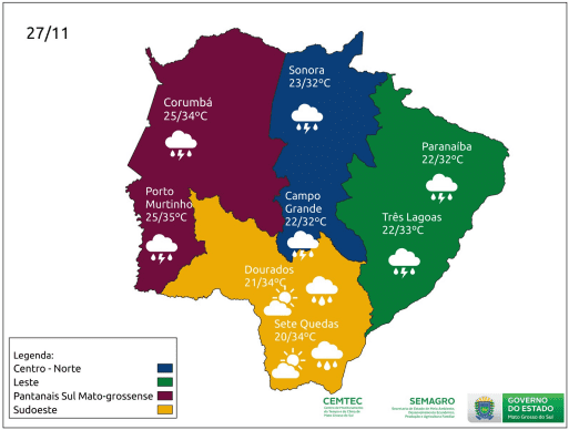 A previsão do tempo para este sábado (27) é de tempo instável com probabilidade de chuva e tempestades isoladas em Mato Grosso do Sul.