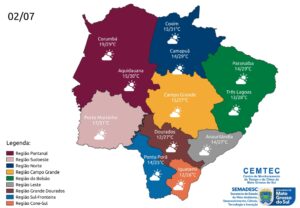 Na capital, Campo Grande, os termômetros devem registrar uma mínima de 15°C. Em Dourados, o dia começa com 12°C e, no leste do Estado, em Anaurilândia, a previsão é de 14°C ao amanhecer. Nestas localidades, a temperatura deve atingir o pico de 27°C no período mais quente do dia. Na fronteira com o Paraguai, Ponta Porã deve marcar 14°C pela manhã, com a temperatura aumentando progressivamente até atingir 25°C na parte da tarde. No sul do estado, em Iguatemi, o clima será ameno pela manhã com 12°C, atingindo 26°C durante o período vespertino.