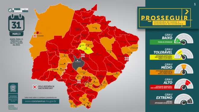 O mapa situacional do Prosseguir apresentado na quarta-feira (31) mostra redução de quatro para uma o número de cidades classificadas na bandeira cinza. No novo mapa apenas Sidrolândia saiu do grau alto para o extremo, quando é recomendado apenas o funcionamento de atividades essenciais.