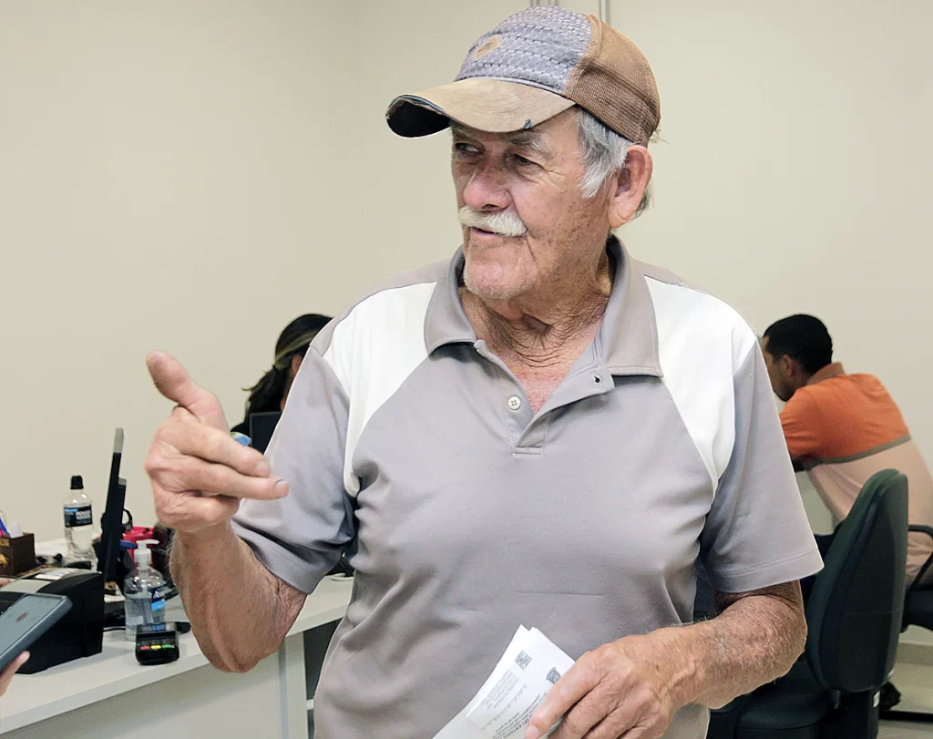 Aos 82 anos, o senhor Rosaría Ferreira, buscou a agência para resolver a documentação do carro que o filho dele usa. Para licenciar precisava regularizar uma infração cometida no Estado de São Paulo (SP). “Não tinha o código para pagamento. Mas o rapaz (servidor da agência) ligou lá em São Paulo e já resolveu. Ainda bem, porque não pode ter nada errado, tem que andar na linha”.