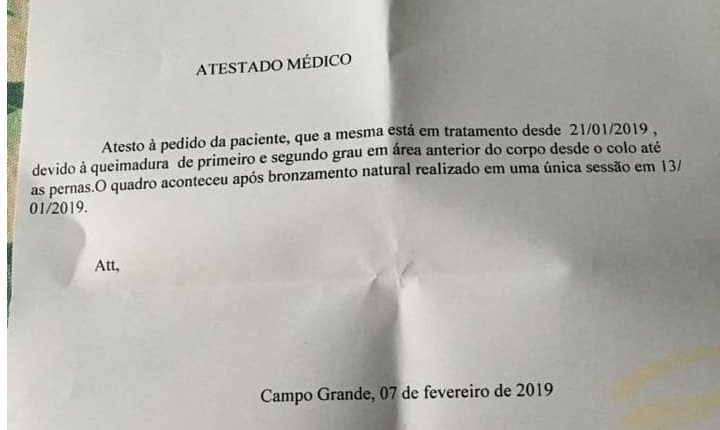 Uma mulher usou as redes sociais para acusar um Centro de Beleza e Estética de negligência após sofrer queimaduras de primeiro e segundo grau durante o procedimento de bronzeamento natural, no dia 13 de janeiro, em Campo Grande. A cliente afirma que o produto usado era para pele negra, mas ela é branca.