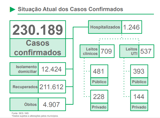 A capital continua com o maior número de infectados em toda a pandemia, apresentando o total de 89.641 pessoas. Dourados vem em segundo lugar com 25,499; Três Lagoas 11,692; Corumbá 11.359 e Naviraí com 6.148 ultrapassando Ponta Porã que registra 5.335 casos no total.