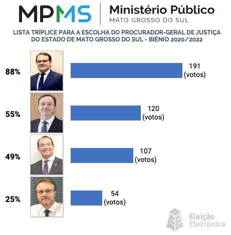 A votação ocorreu pelo Sistema de Eleição Eletrônica, em virtude das medidas adotadas para conter o avanço do novo coronavírus (Covid- 9). Segundo o MP-MS, pela primeira vez na história do órgão, um Promotor de Justiça ocupará o cargo mais alto na hierarquia Institucional.