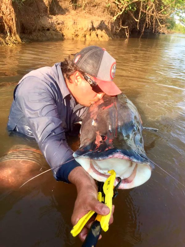 Peixe com mais de um metro ganha beijo de pescador ao ser solto em rio de MS. — Foto: Rodrigo Jorge/Arquivo pessoal
