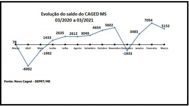 Apesar da pandemia do coronavírus, Mato Grosso do Sul apresentou saldo positivo de empregos em nove dos últimos 12 meses, sendo que em março de 2021 obteve o terceiro melhor desempenho neste período. Isto mostra a evolução do Estado neste setor, com manutenção dos investimentos, equilíbrio e fomento à economia