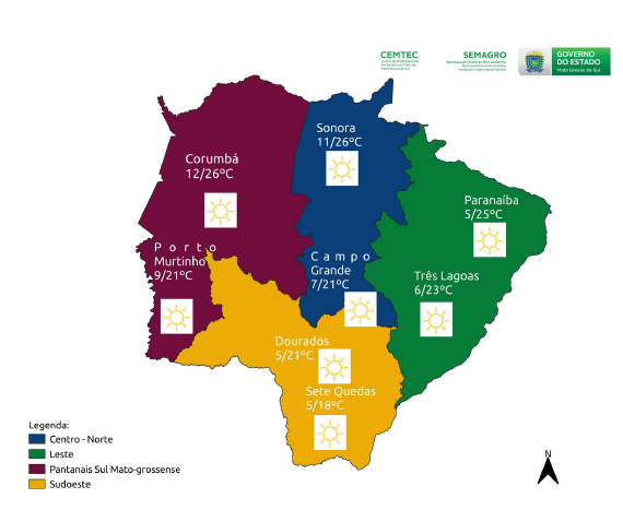 O Cemtec também alerta para os baixos níveis de umidade relativa do ar que podem ficar entre 10-30% especialmente nas regiões norte, leste e norte da região pantaneira. As temperaturas por região podem ser conferidas no mapa.