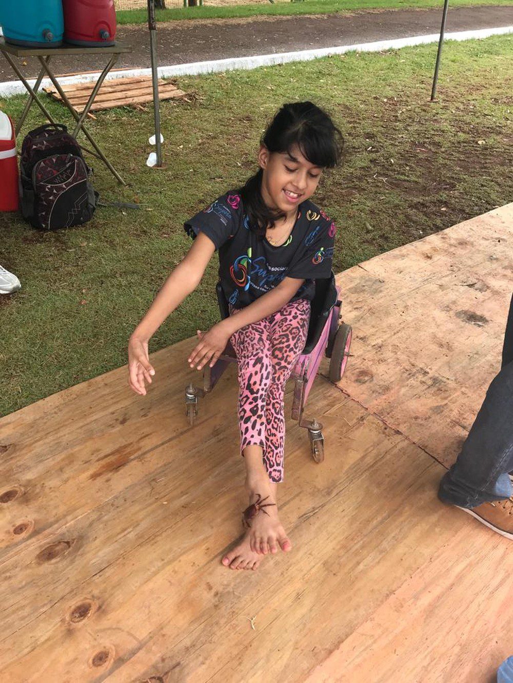 “Ele tem sido um anjo. Pois ajudou a realizar o sonho dela de poder sair do lugar. Ele [Clóvis] é fantástico. Mesmo sem instrução de um profissional, ele se esforçou e conseguiu adaptar objetos para que minha filha pudesse se locomover, eu realmente sou imensamente grata”, chora.