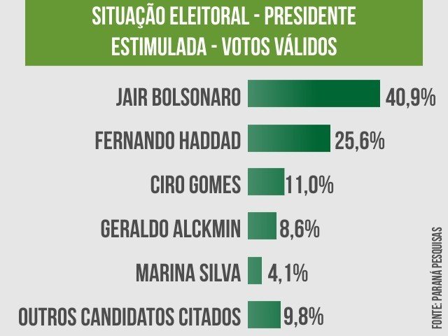 Levantamento divulgado pelo instituto Paraná Pesquisas, nesta sexta-feira (dia 5), aponta Jair Bolsonaro (PSL) com 40,9% e Fernando Haddad (PT) tem 25,6%.
