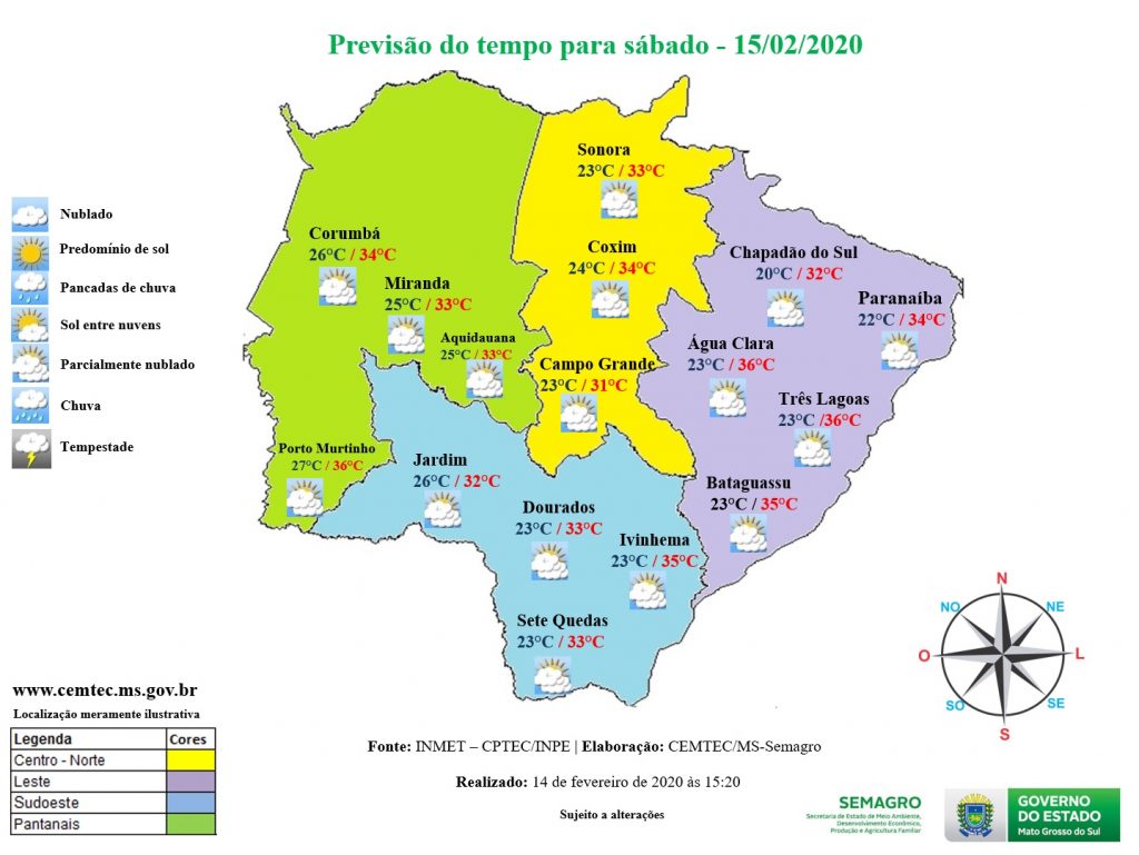 O tempo deve ficar mais firme neste fim de semana em Mato Grosso do Sul. Conforme o Centro de Monitoramento do Tempo e do Clima (Cemtec), as chuvas estimadas serão em forma de pancadas isoladas associadas as elevadas temperaturas e altos valores de umidade do ar. A máxima prevista para o sábado (15.02) e para o domingo (16.02) é de 36°C.