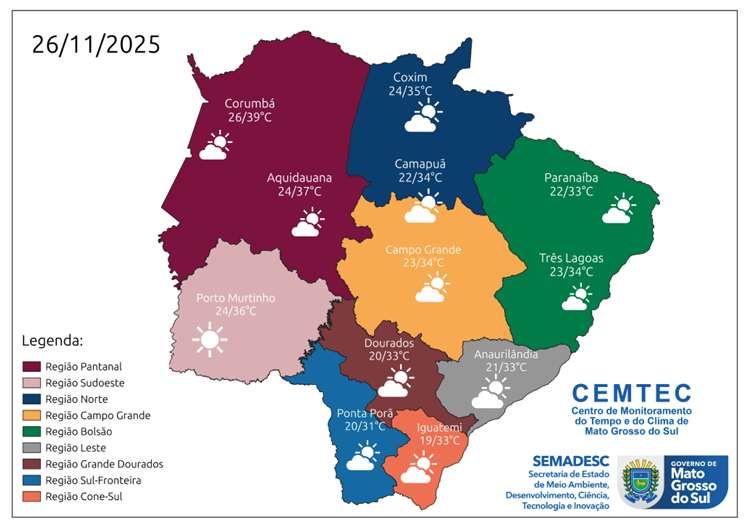 - Pantaneira e Sudoeste: mínimas variando entre 18°C e 26°C; máximas de 32°C a 39°C.