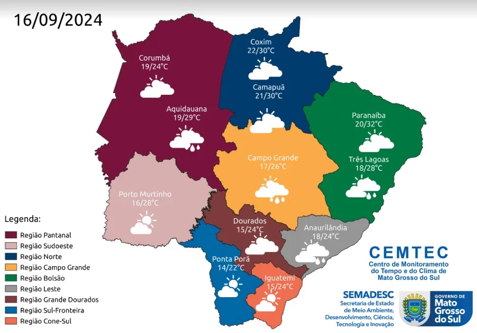 Em Paranaíba e região mínima de 18°C e máxima 36°C, assim como no Norte. Para Campo Grande a meteorologia indica temperaturas entre 17°C e 31°C. Pontualmente podem ocorrer rajadas de vento acima de 60 km por hora.