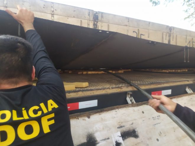 Amambai (MS), 25 de junho – Policiais do Departamento de Operações de Fronteira (DOF) apreenderam, na tarde desta sexta-feira, um cavalo trator Sinotruck branco acoplado a um semirreboque, com um fundo falso onde estavam os volumes prensados do entorpecente.
