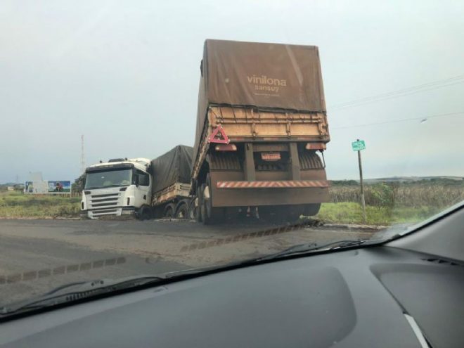 O condutor de uma carreta segundo informações perdeu a direção do veículo quando contornava a rotatória.