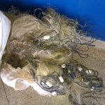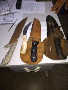 Momento em que o homem correu para uma reserva ambiental que fica aos fundo da residência e a Mulher de 42 anos que estava na residência se trancou vindo a sair para fora minutos depois. Em averiguação no quintal da residência foi constatado restos de animais, 4 redes de pesca, 1 tarrafa e 4 facas com características de uso em abate de animais.
