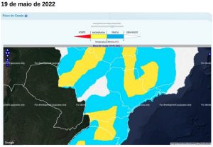 A massa de ar frio associada a um sistema de alta pressão atmosférica mantém as temperaturas baixas em Mato Grosso do Sul, nesta quinta-feira (19), e há probabilidade de geada de fraca a moderada, principalmente no centro-sul do Estado.