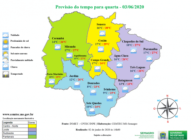 Confira no mapa elaborado pelo Centro de Monitoramento do Tempo e do Clima (Cemtec) como ficará o tempo em Campo Grande e em algumas regiões do Estado.