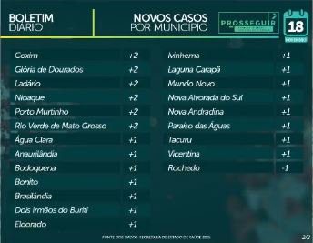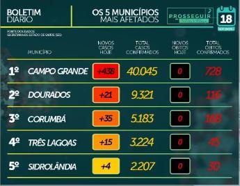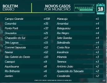 Os novos casos de hoje trazem Campo Grande à frente, com 438 novos casos, seguida por Corumbá (35), Ponta Porã (32), Dourados (21), dentre outros. Confira a tabela na galeria abaixo para mais detalhes e demais localidades.