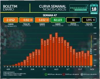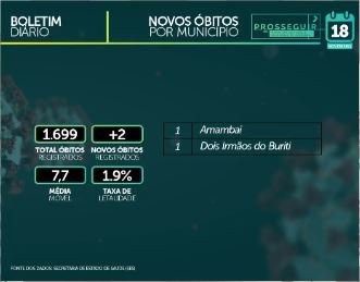 Com bases nos números, a média móvel no Estado foi calculada em 523,4 casos por dia, nos últimos 7 dias. O boletim traz que nas últimas 24 horas foram registrados dois óbitos, elevando o total de vítimas fatais em MS para 1.699 e a média móvel em 7,7 óbitos por dia, nos últimos 7 dias, além de taxa de letalidade de 1,9%. As novas mortes foram registradas em Amambai e Dois Irmãos do Buriti.
