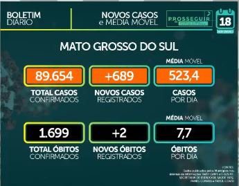 Mato Grosso do Sul já soma 89.654 casos confirmados de Covid-19, com 689 novos registros nesta quarta-feira (18). Foram registradas mais duas mortes, conforme o boletim epidemiológico do novo coronavírus, da SES (Secretaria de Estado de Saúde).