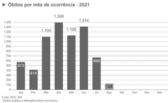 Nos 11 primeiros dias de agosto foram 128 mortes por Covid, o que chega a uma média de 11,6 por dia. Em 2021 a menor média até então era de fevereiro, com 14,7 por dia. A pior foi no mês de abril, que registrou 1.398 em 30 dias, tendo uma média diária de 46,6 óbitos.