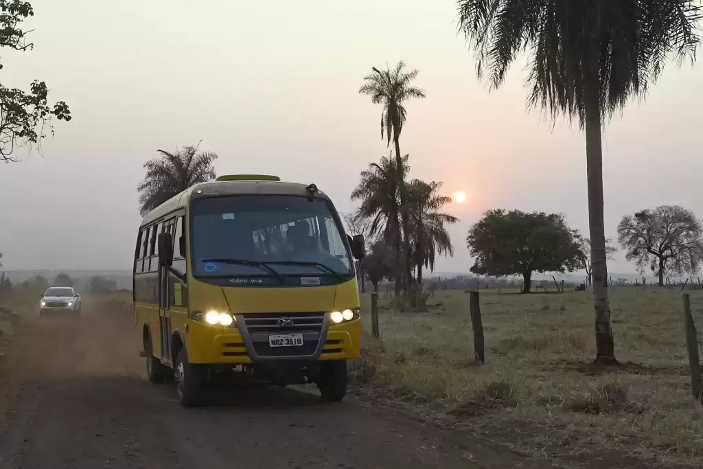 Com os primeiros raios de sol no horizonte, os alunos que moram na área rural de Terenos, município que fica a aproximadamente 40 quilômetros de Campo Grande, já se prepararam para chegar até a escola.
