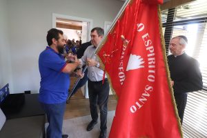 O governador Eduardo Riedel recebeu nesta segunda-feira (3) a visita da Bandeira do Divino Espírito Santo. O padre Sérgio Marcon, da Catedral São José de Coxim, aproveitou a oportunidade abençoar o local e orar por todos os prédios do Parque dos Poderes.