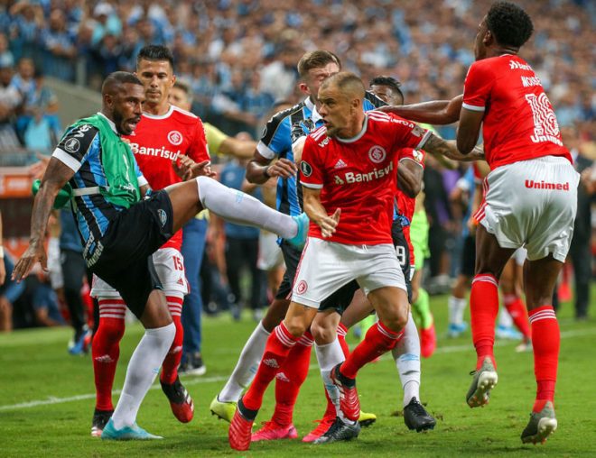 Mas toda a emoção e disputa acumuladas na partida foram ofuscadas aos 40 minutos, quando Pepê e Moisés iniciaram uma briga que acabou envolvendo todos os jogadores, inclusive os reservas. Após 12 minutos de confusão, oito jogadores receberam o cartão vermelho: Pepê, Luciano, Caio Henrique e Paulo Miranda pelo lado do Grêmio e Moisés, Edenílson, Praxedes e Victor Cuesta pelo Inter.