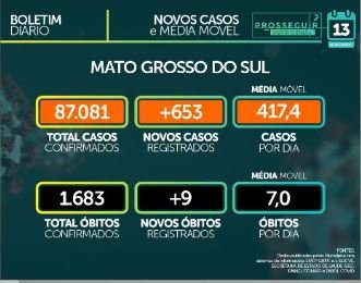 Mato Grosso do Sul já soma 87.081 casos confirmados de Covid-19, com 653 registros nesta sexta-feira (13). Foram registradas mais nove óbitos, conforme o boletim epidemiológico do novo coronavírus, apresentado pela SES (Secretaria de Estado de Saúde).