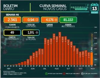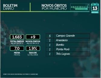 Com bases nos números, a média móvel no Estado foi calculada em 417,4 casos por dia, nos últimos 7 dias. O boletim traz que nas últimas 24 horas foram registrados nove óbitos, elevando o total de vítimas fatais em MS para 1.683 e a média móvel em 7 óbitos por dia, nos últimos 7 dias, além de taxa de letalidade de 1,9%.