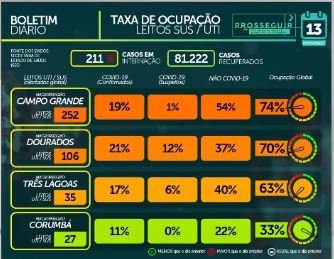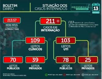 Dos 87.081 casos confirmados em MS, 81.222 já estão recuperados. Em relação às internações, MS tem 211 pacientes internados, além de um paciente de outro estado que não é contabilizado como confirmado de MS. Destes 109 estão em leitos clínicos (70 públicos e 39 privados) e 103 em leitos de UTI (Unidade de Terapia Intensiva), dos quais 78 estão em leitos públicos e 25 em privados.