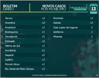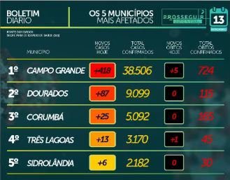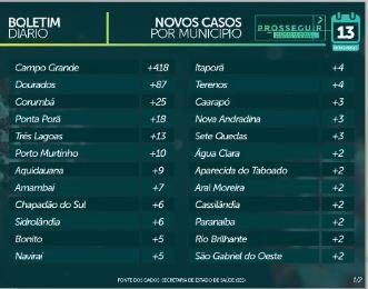 Os novos casos de hoje trazem Campo Grande à frente, com 418 novos casos, seguida por Dourados (87), Corumbá (25), Ponta Porã (18), dentre outros. Confira a tabela na galeria abaixo para mais detalhes e demais localidades.