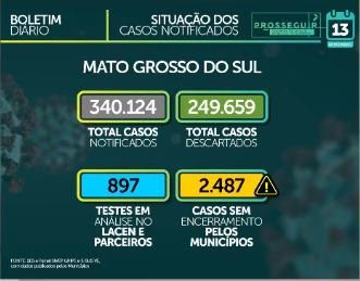 A SES também destacou que MS já contabiliza um total de 340.124 casos notificados, dos quais 249.659 foram descartados. Há 897 testes em análise no Lacen (Laboratório Central de Saúde Pública) e 2.487 casos sem encerramento pelos municípios.