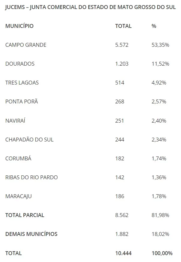 Na distribuição geográfica de empresas, a concentração persiste nas maiores cidades no mês passado. Campo Grande lidera com 416, seguida de Dourados (90), Três Lagoas (33), Naviraí (25), Ponta Porã (25), Corumbá (24) e Nova Andradina (20).