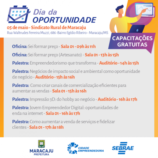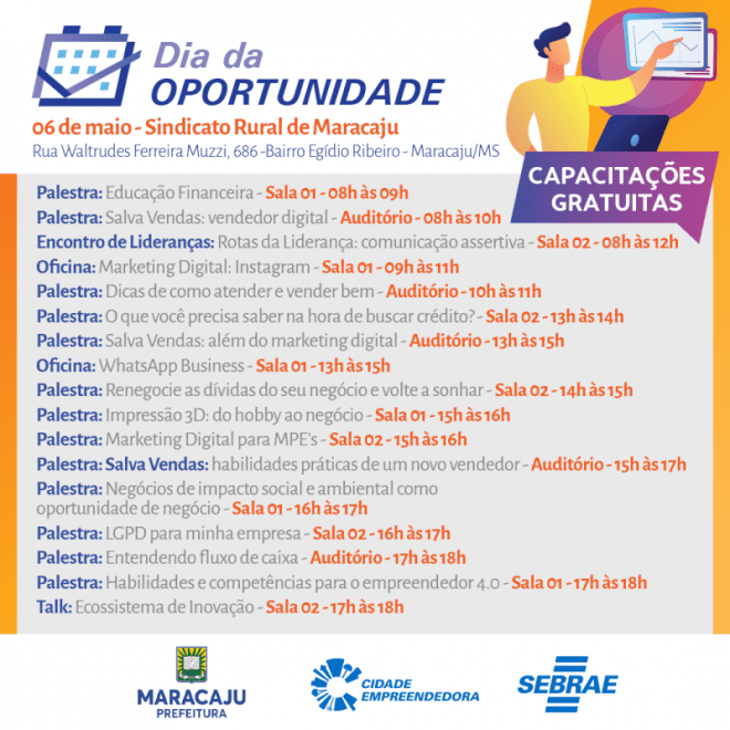 Maracaju se tornará a capital do empreendedorismo e das oportunidades nos dias 05 e 06 de Maio, através de uma ação do Programa Cidade Empreendedora, fruto de uma parceria do SEBRAE com a Prefeitura de Maracaju, ocorrerá uma nova edição do “Dia da Oportunidade”, evento que conta com cursos, exposição e tecnologia voltadas ao empresários, empreendedor e aqueles que buscam novas oportunidades de negócio e de trabalho.
