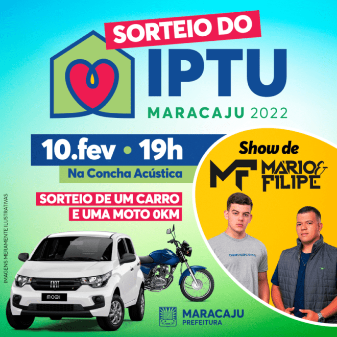 A Prefeitura de Maracaju por meio da Secretaria Municipal de Planejamento e Fazenda vem a público convidar toda a comunidade maracajuense para participar do evento festivo, que marcará o Sorteio de um Carro e uma Motocicleta Zero KM, aos contribuintes aptos para participar do sorteio que são aqueles que pagaram o IPTU de 2022 até 31/12/2022 e  estão em dia com os últimos 5 anos (2017 a 2021).