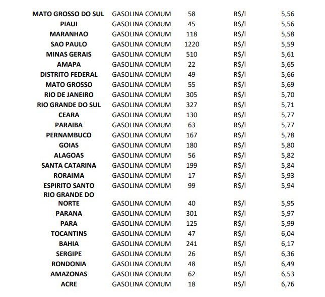 Mato Grosso do Sul lidera a lista (mais baratos) junto com o Piaui, que também tem preço médio da gasolina de R$ 5,56. Logo depois aparece na sequência o Maranhão (R$ 5,58), São Paulo (R$ 5,59), Minas Gerais (R$ 5,61), Amapá (R$ 5,65), Distrito Federal (5,66), Mato Grosso (R$ 5,69) e Rio de Janeiro (R$ 5,70).