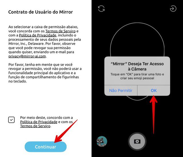 Passo 1. Instale o app Mirror no seu celular. Ao abri-lo pela primeira vez, concorde com os termos de uso do aplicativo e toque em “Continuar”. Em seguida, permita que o app acesse a câmera;
