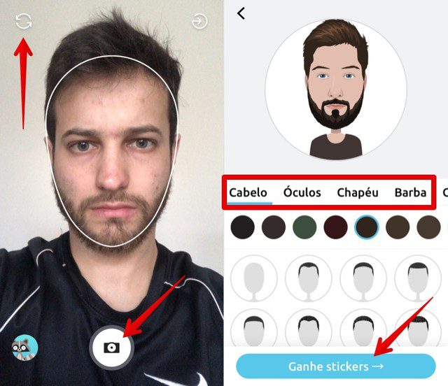 Passo 2. Use o ícone no canto superior esquerdo da tela para alternar entre a câmera frontal e traseira do celular. Posicione o seu rosto no local indicado e tire uma selfie. O Mirror, então, fará um avatar automaticamente do seu rosto. Caso queira, você pode personalizar o cabelo e barba ou adicionar acessórios como óculos e chapéu. Após fazer os ajustes desejados, toque em “Ganhe stickers”;