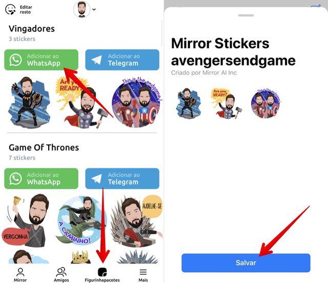 O Mirror é um aplicativo gratuito para baixar no Android e iPhone (iOS) que permite criar figurinhas com o seu rosto para usar no WhatsApp. O app usa a câmera do celular para detectar as características físicas do usuário e criar automaticamente os avatares, que podem ser personalizados com acessórios. Posteriormente, a ferramenta cria pacotes com temas variados que podem ser importados pelo mensageiro e enviados aos seus amigos e grupos pelo bate-papo online.