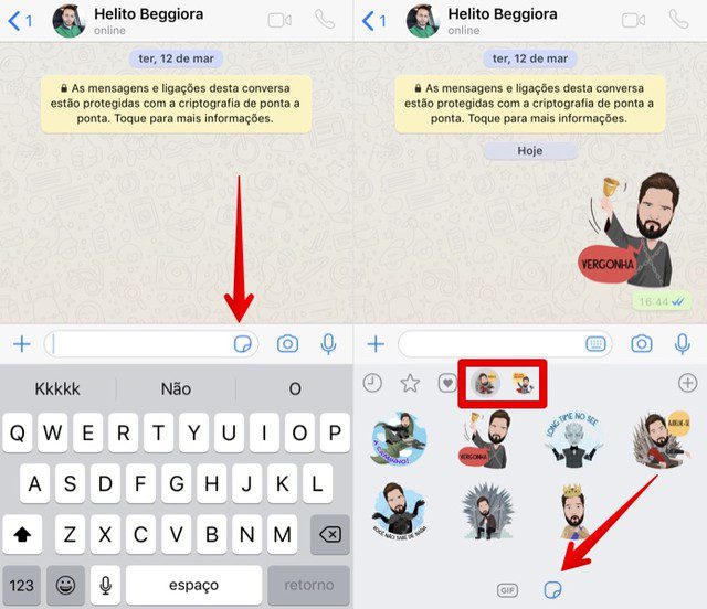 Passo 5. Para acessar as figurinhas, abra uma conversa do WhatsApp e toque sobre o ícone ao lado do campo de texto. Agora, abra a aba de stickers e toque sobre o ícone do pacote, na parte superior.
