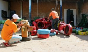 Nas mãos dos internos, os pneus em desuso se transformam em peças lúdicas e criativas