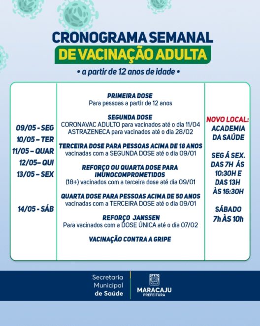 A Prefeitura de Maracaju através da Secretaria de Saúde divulga o Cronograma de Vacinação para esta semana do dia 02/05 à 07/05, com a imunização da PRIMEIRA DOSE, SEGUNDA DOSE e TERCEIRA DOSE e QUARTA DOSE ou DOSE REFORÇO da vacina contra a Covid-19, e VACINAÇÃO CONTRA A GRIPE.