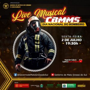 Em comemoração ao Dia Nacional do Bombeiro Militar, comemorado nacionalmente nesta sexta-feira (02) o Corpo de Bombeiros Militar de Mato Grosso do Sul (CBMMS) realiza uma Live Musical a partir das 19h30 com transmissão pelos canais oficiais do Governo do Estado.