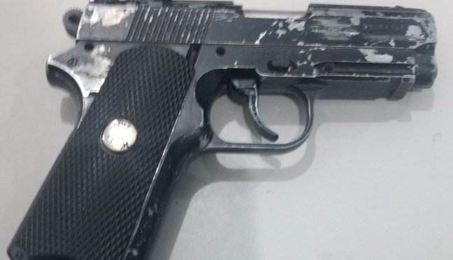 Com as informações do autor a guarnição deslocou em rondas pelas ruas do bairro deparando com o um homem de mesmas características que em busca pessoal foi localizado na cintura um pistola de plástico.