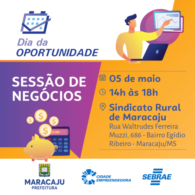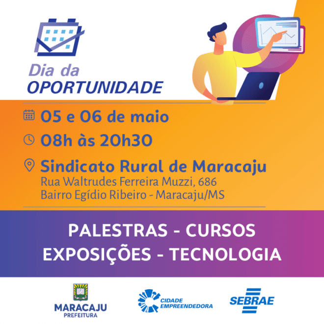 Com uma ampla programação, o Dia da Oportunidade será realizado em Maracaju será realizado nos dias 5 e 6 de maio, além das capacitações, sessões de negócios, na oportunidade a Secretária Municipal de Saúde estará realizando atendimentos, como vacinação da Influenza, orientações médicas e aferição de pressão arterial.