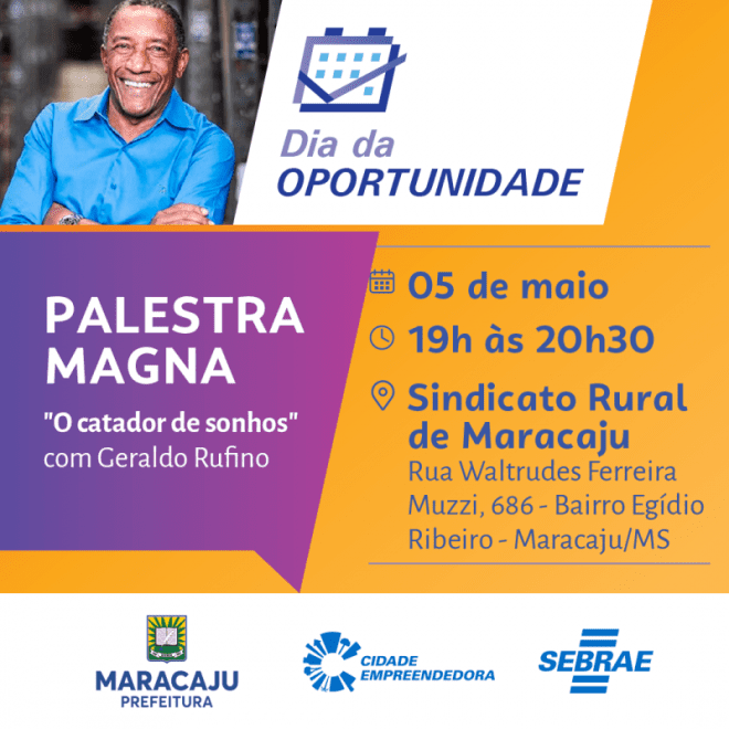 No total, o Dia da Oportunidade traz 25 capacitações, entre oficinas e palestras, e a principal delas é a palestra magna com o empresário case de sucesso Geraldo Rufino, além disso, o evento traz também para o público uma amostra de inovação e a sessão de negócios, voltada para conectar as pequenas empresas aos grandes empreendimentos. Nos dois dias, os horários são de 8h às 20:30h.