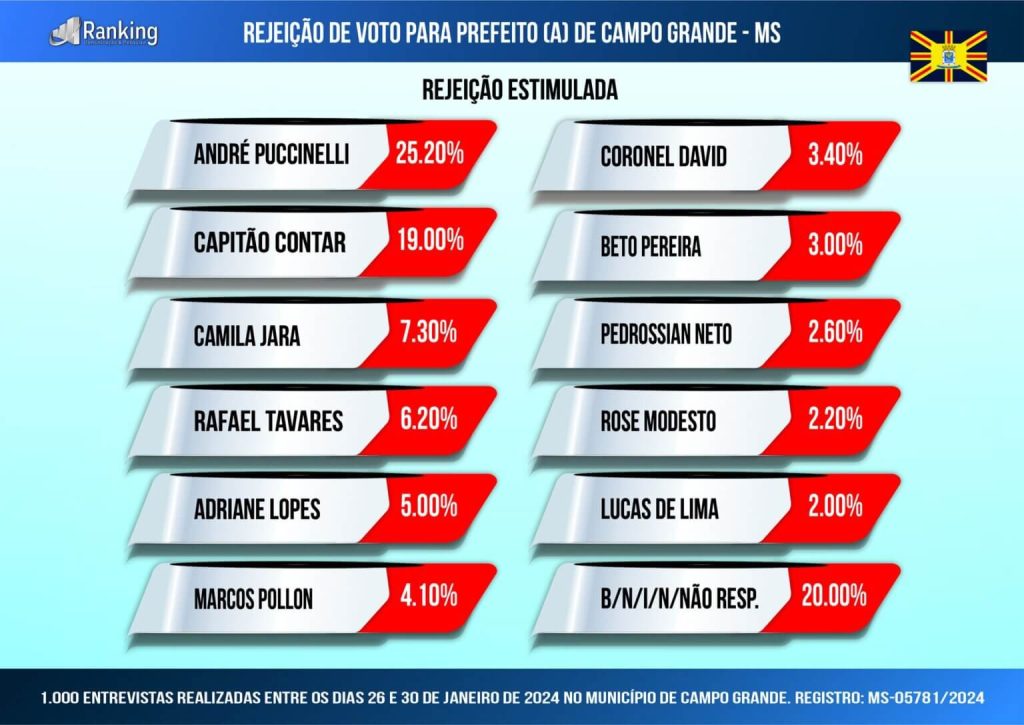 Na pesquisa de rejeição, o líder é André Puccinelli, com 25,2%, seguido pelo Capitão Contar, com 19%, Camila Jara, com 7,3%, Rafael Tavares, com 6,2%, Adriane Lopes, com 5%, Marcos Pollon, com 4,1%, Coronel David, com 3,4%, Beto Pereira, com 3%, Pedro Pedrossian Neto, com 2,6%, Rose Modesto, com 2,2%, e Lucas de Lima, com 2%, Rodrigo Lins, sendo que 20% não sabem ou não responderam.