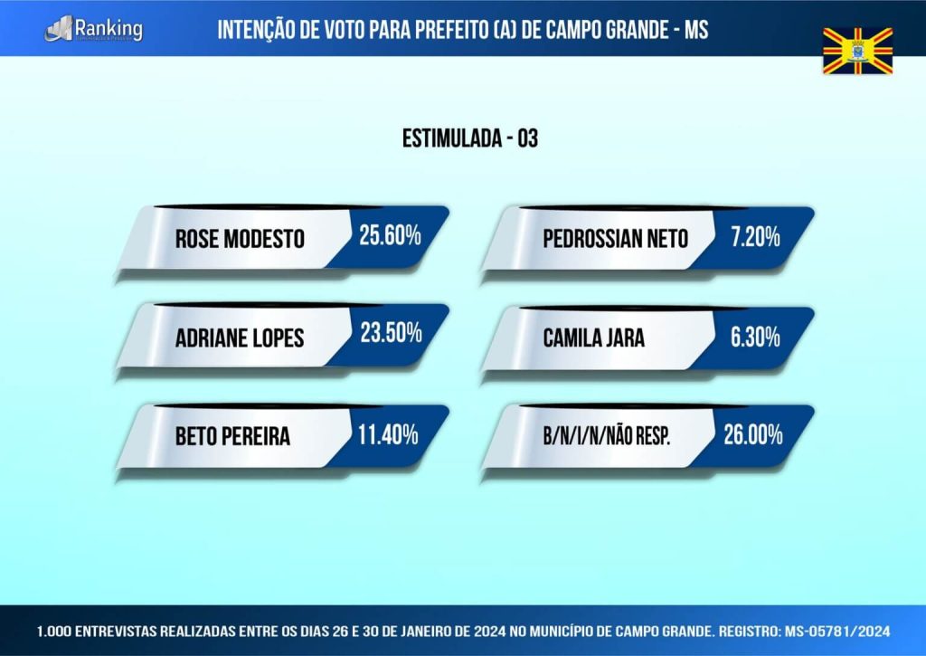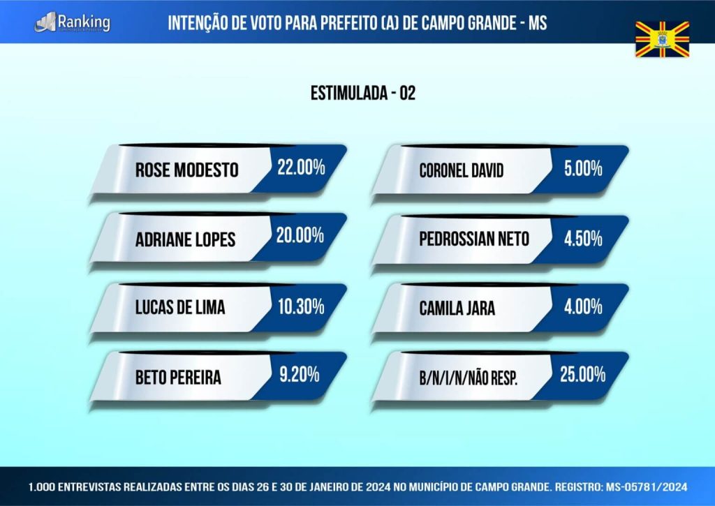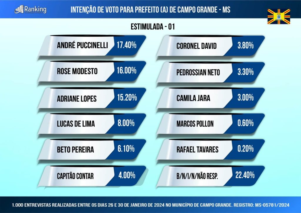 Na pesquisa estimulada, o Instituto Ranking Brasil Inteligência fez quatro cenários e no primeiro o líder ainda é o ex-governador André Puccinelli, com 17,4%, tecnicamente empatado com a ex-deputada federal Rose Modesto, com 16%, e com a prefeita Adriane Lopes, com 15,2%. Na segunda parte, aparecem o deputado estadual Lucas de Lima, com 8%, o deputado federal Beto Pereira, com 6,1%, o ex-deputado estadual Capitão Contar, com 4%, e o deputado estadual Coronel David, com 3,8%.