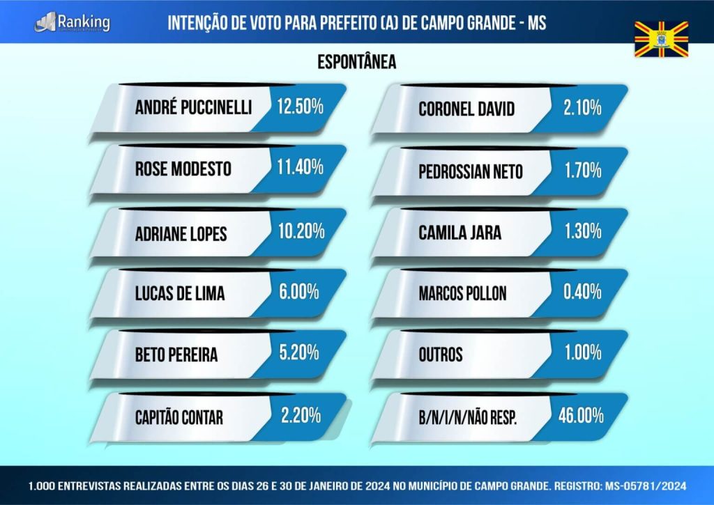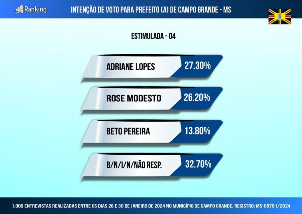 O Instituto Ranking Brasil Inteligência, a pedido do Diário MS News, conduziu uma pesquisa para a eleição de prefeito(a) de Campo Grande em 2024, registrada no TSE (Tribunal Superior Eleitoral) sob o número MS-05781/2024. No período de 26 a 30 de janeiro deste ano, foram entrevistados 1.000 moradores com 16 anos ou mais de idade, abrangendo todas as regiões da cidade. A pesquisa possui um intervalo de confiança de 95%, com margem de erro máxima estimada de 3,1% para mais ou para menos.